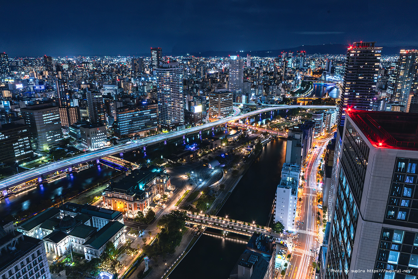 大阪の歴史ある建築物の威厳のある姿、最先端の高層ビル群、「水都の名は大阪のもんです」と言わんばかりな中之島の水景、と要素盛りだくさんな夜景が楽しめる夜景スポットです。